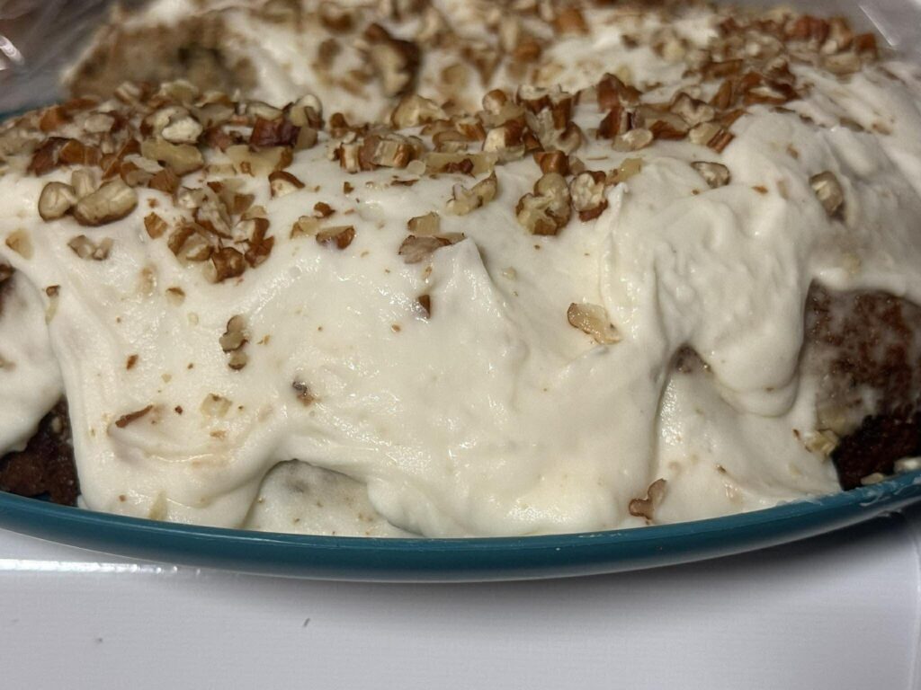 Whip the cream cheese until fluffy(ish) then add in the powdered sugar, salt and vanilla. beat well, using the Greek yogurt to thin out if needed. Frost the cake when it is completely cool. Optional, but delicious: garnish with chopped pecans.